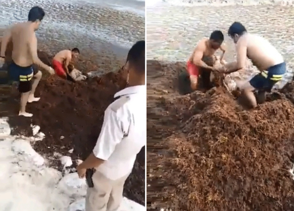 En el video de poco más de dos minutos, se observa cuando visitantes de la zona turística pidieron la ayuda de equipos de emergencia a través del 911 debido a que una turista se encontraba atrapada entre el sargazo.