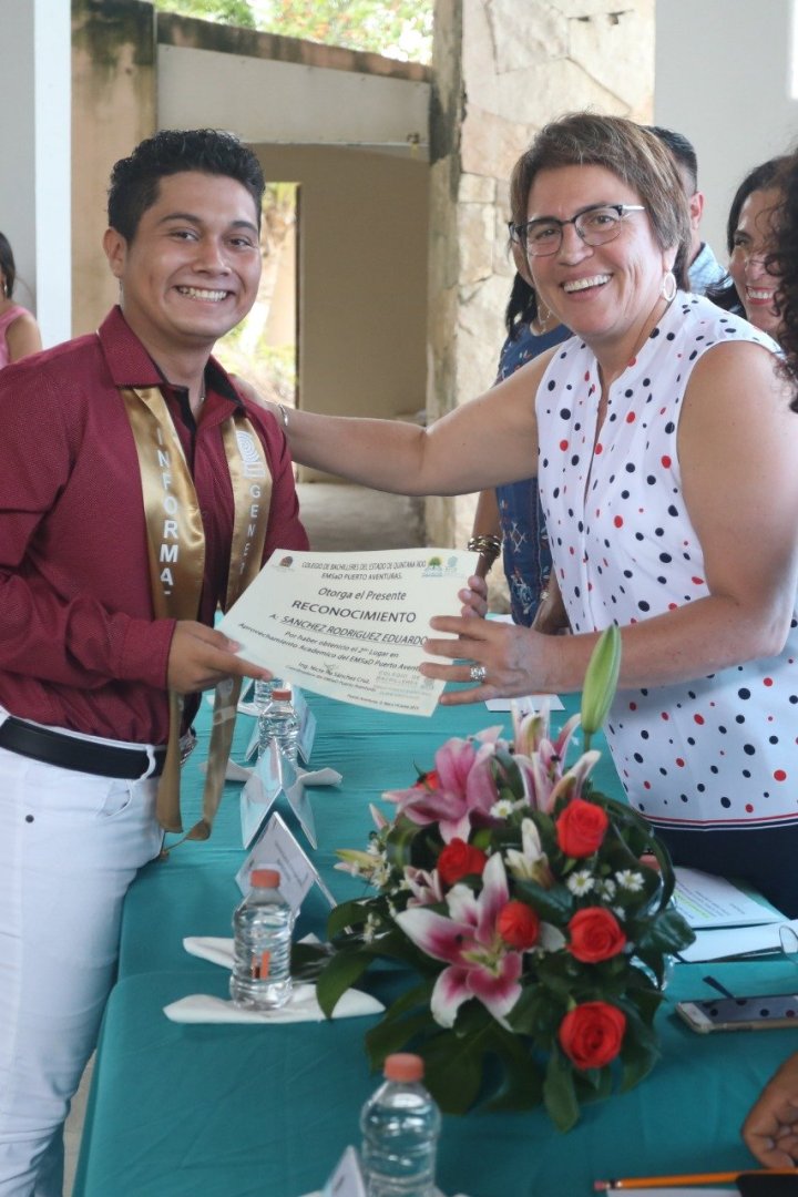 Realidades.- En el marco de la graduación de 59 alumnos del Colegio de Bachilleres (Cobach) de Puerto Aventuras, novena generación, la presidenta municipal Laura Beristain Navarrete, reconoció el esfuerzo realizado por los graduados, así como de sus padres de familia y profesores, para lograr cumplir esta meta educativa, al tiempo que exhortó a los alumnos a continuar con sus estudios profesionales “porque estudiar en la vida no tiene límites”, citó la edil al destacar que el aprendizaje nunca termina.