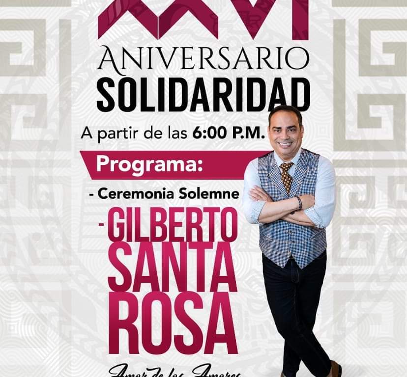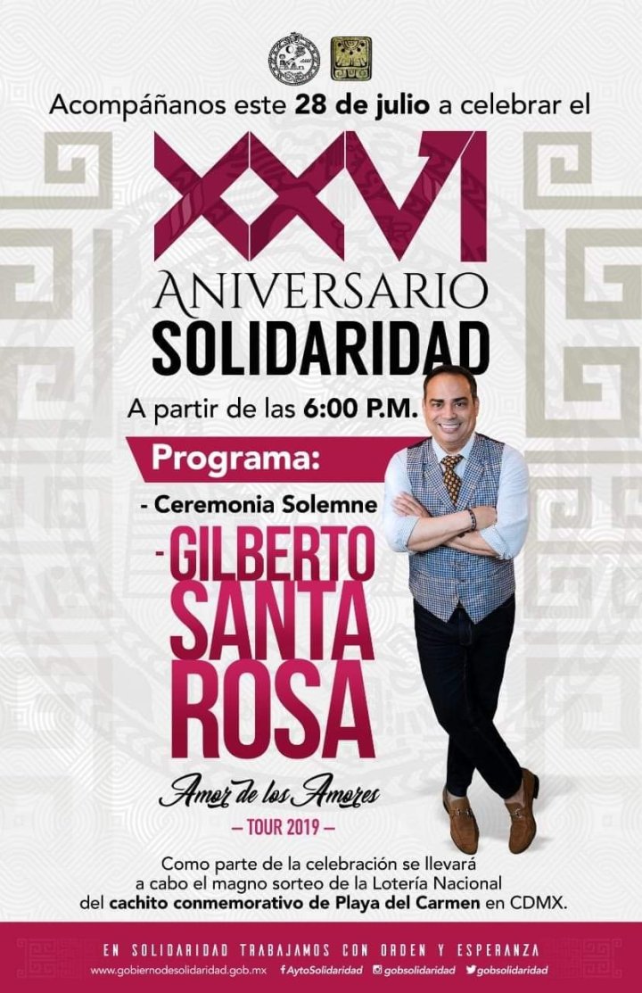 La primera actividad, será la Sesión Pública y Solemne de Cabildo, con la participación de representantes de los tres poderes del estado de Quintana Roo. Posteriormente, se transmitirá el sorteo del billete de lotería que tiene la imagen del municipio de Solidaridad, desde la oficina de la Lotería Nacional para la Asistencia Pública, en la Ciudad de México. Por último, será la presentación estelar del cantante puertorriqueño Gilberto Santa Rosa.