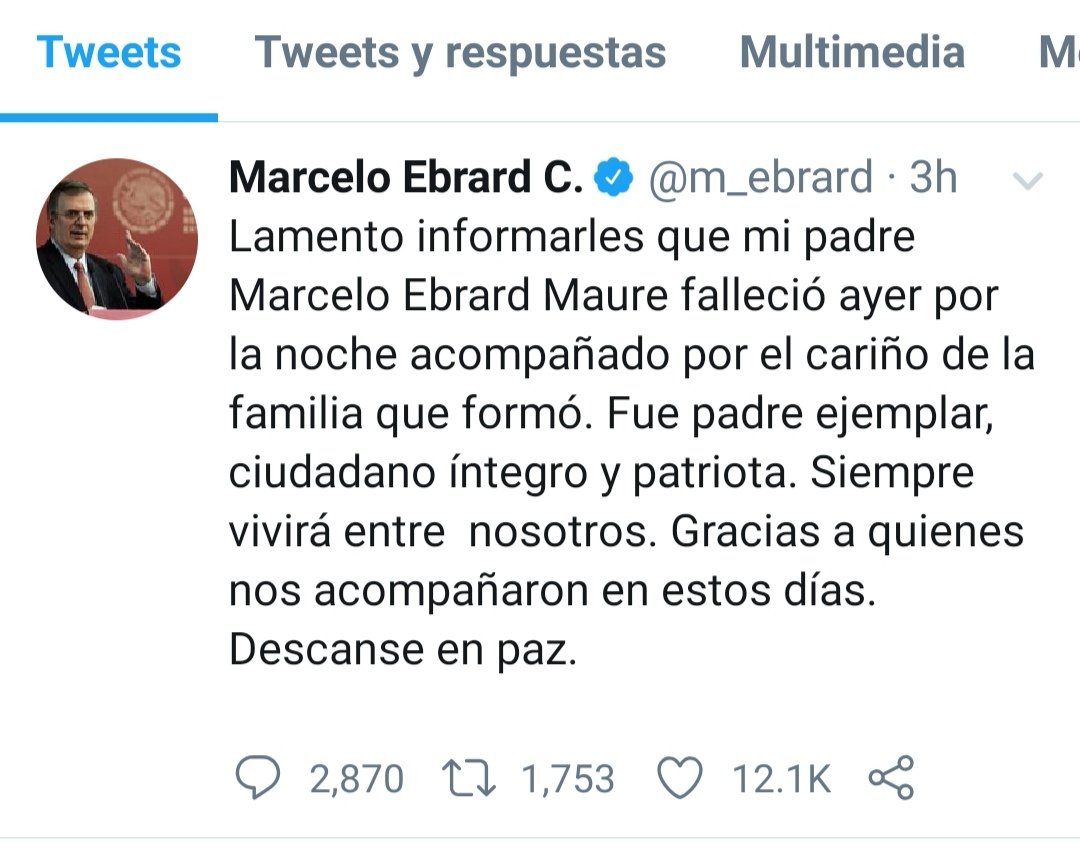 Realidades.- El secretario de Relaciones Exteriores, Marcelo Ebrard, informó que la noche del sábado falleció su padre, Marcelo Ebrard Maure.