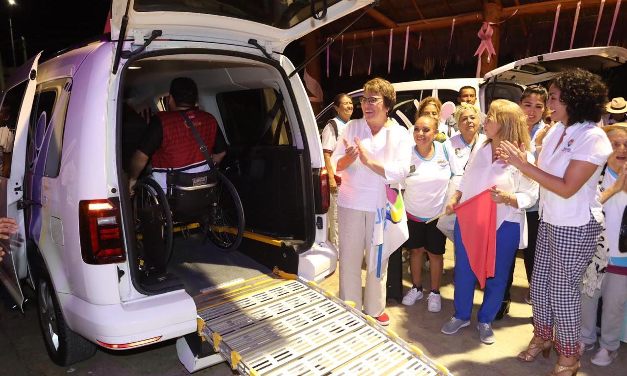 Realidades.- La presidente municipal de Solidaridad, Laura Beristain Navarrete, suma esfuerzos con el Sistema de Desarrollo Integral de la Familia (DIF) Municipal y Estatal, dando el banderazo de arranque del servicio de transporte inclusivo a bajo costo que se brinda a personas con discapacidad.