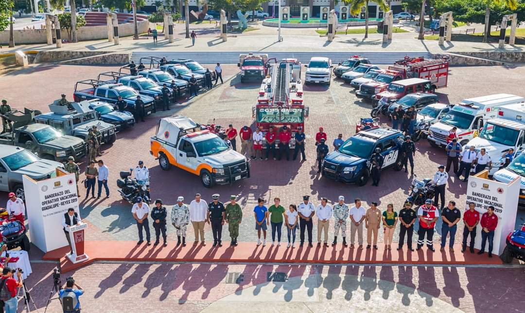 Realidades.- Con la presencia de titulares y representantes de las corporaciones de seguridad pública de los tres órdenes de gobierno, Guardia Nacional, Bomberos, cuerpos de emergencias y Protección Civil, la presidente municipal de Solidaridad, Laura Beristain Navarrete, dio el banderazo de inicio del Operativo Vacacional Guadalupe-Reyes 2019, donde participan más de mil elementos para reforzar la seguridad, atención a los turistas y la ciudadanía en general.