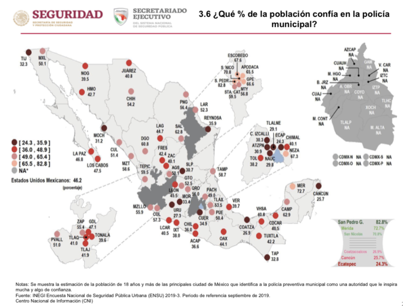 En gráfica aparte, la SSPC evidenció que Cancún es de las ciudades cuyos habitantes menos confían en la policía, pues únicamente 25.7 por ciento de la población se encomienda a las corporaciones policiales.