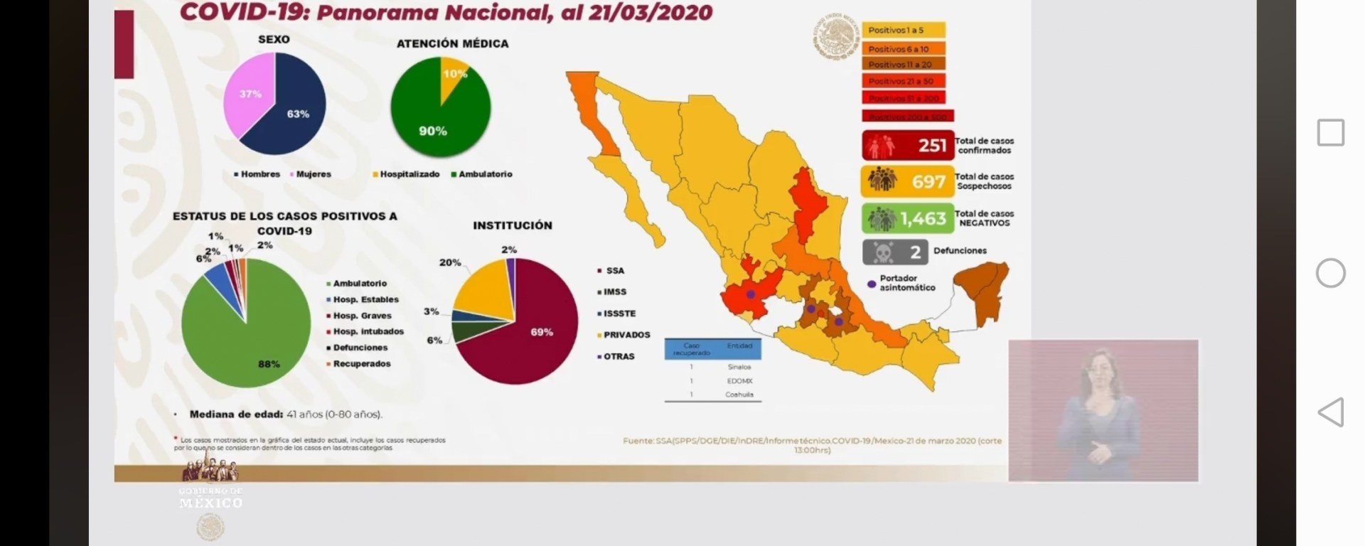 Realidades.- En las últimas 24 horas, la cifra de infectados en México por la pandemia de covid-19 ha aumentado de 203 a 251, según el último balance anunciado este sábado en rueda de prensa por representantes del Ministerio de Salud del país latinoamericano.