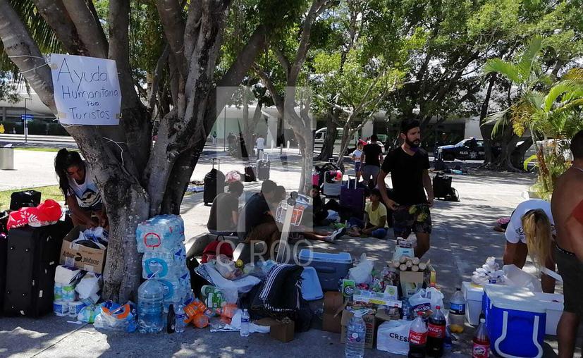 Debido a que no tienen una fecha de regreso y están a la espera de que les avisen cuándo podrán abordar una aeronave que les lleve a casa, este grupo de turistas permanece en los jardines del aeropuerto y hasta ahí hay personas que les han hecho llegar víveres para hacer menos complicada la espera.