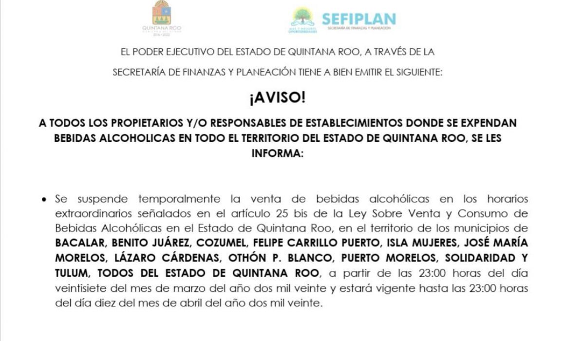 La medida, de acuerdo con la Sefiplan, suspende temporalmente la venta de bebidas alcohólicas en horarios extraordinarios señalados en el Artículo 25 bis de la Ley sobre venta y consumo de bebidas alcohólicas en Quintana Roo.