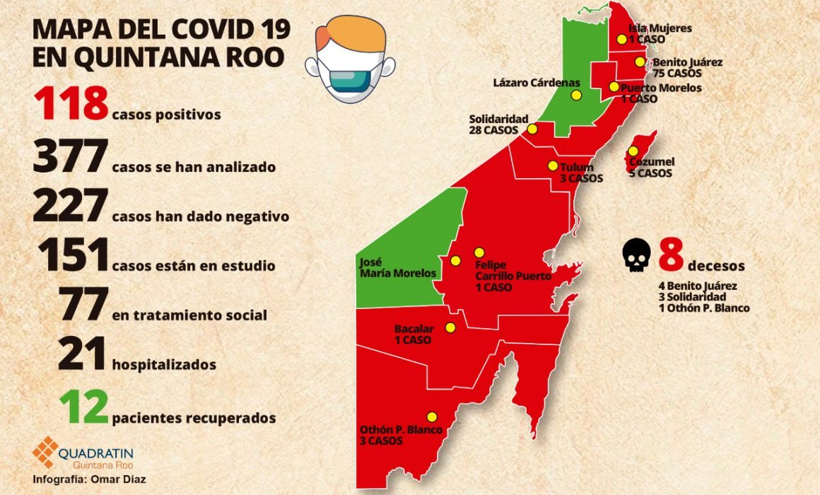 Con 75 casos positivos, Benito Juárez es el municpio más afectado, le sigue Solidaridad con 28; Cozumel con cinco; Othón Pompeyo Blanco con tres; Tulum también tres; Bacalar, uno y Felipe Carrillo Puerto con uno.