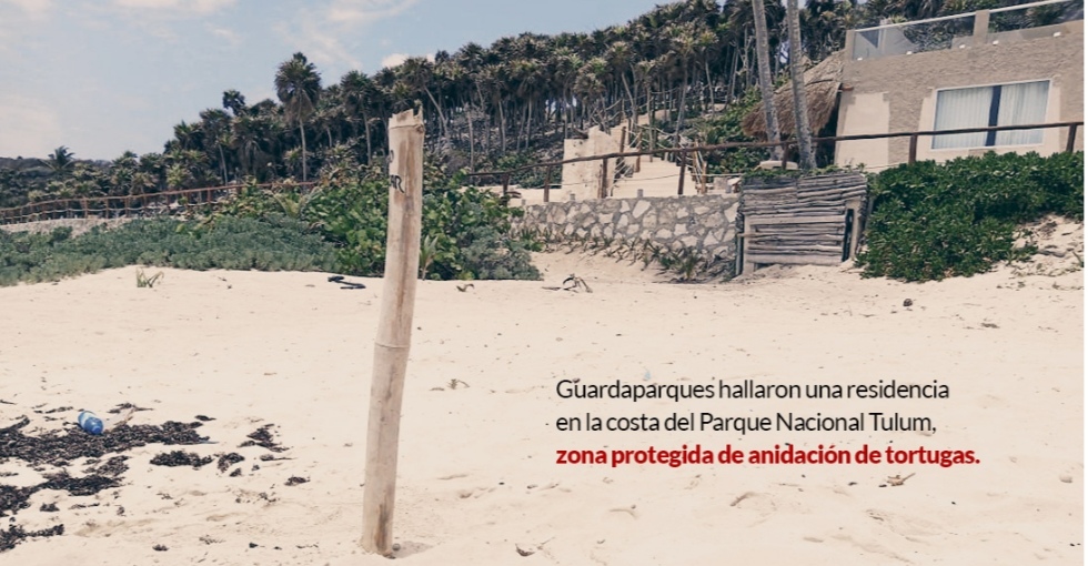 La residencia hallada está en la playa dentro de la Reserva de la Biosfera del Caribe Mexicano, donde anidan las tortugas, por lo que está cortando el flujo de la duna costera afectando la llegada de los quilones.
