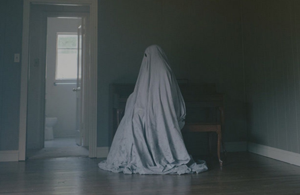 La escena se extiende a lo largo de casi cinco minutos en los que el espectador observa cómo la mujer, a quien el director y guionista del filme David Lowery ha llamado M, come el pastel con dolor, levantando el ritmo de sus bocados hasta no poder ingerir algo más. Corre al baño y vomita. A la mitad del cuadro, el fantasma de su pareja ha observado todo, su inexpresivo manto sólo se mueve lentamente para seguir su camino del suelo al baño. El dolor es evidente en ambos y también puede llegar al espectador. Esta es una escena de Historia de fantasmas (A Ghost Story, 2017), un singular filme que ofrece un delicado retrato de la vida después de la vida.