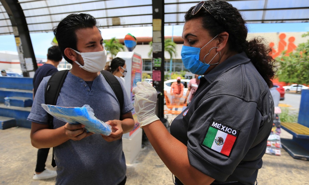 Realidades.- Entrega, Gobierno de Solidaridad, kits sanitizantes a turistas y locales que ingresan a la ciudad en el acceso Playa-Cancún y paraderos de transporte, para recordar no bajar la guardia y continuar medidas de prevención contra el COVID19.