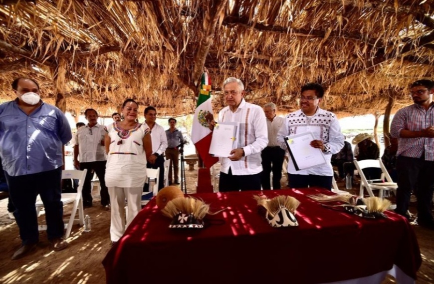 Acompañado de la secretaría del Bienestar, María Luisa Albores; el titular del Instituto Nacional de los Pueblos Indígenas, Adelfo Regino; y el secretario de Desarrollo Agrario, Territorial y Urbano, Román Meyer, el Presidente informó que el grupo de trabajo conformado por Conagua, Sedatu, la Procuraduría Agraria, el Registro Agrario Nacional y el Fideicomiso Fondo Nacional de Fomento Ejidal, ya comenzó a trabajar en el establecimiento legal de la propiedad de los terrenos para las comunidades.