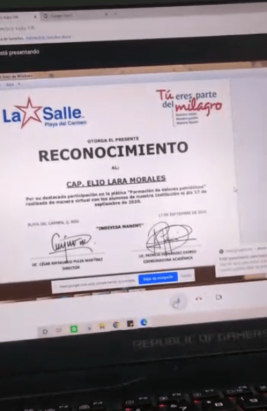 Finalmente las autoridades educativas de La Salle entregaron un reconocimiento virtual al Regidor Elio Lara Morales por su valiosa labor en servicio de los alumnos del plantel La Salle Playa del Carmen que podrá ser visualizado por cualquier persona con acceso a facebook.