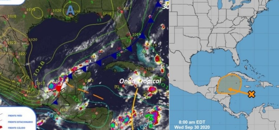 En el otro litoral de la Península, es decir, en el Caribe, las cosas también empiezan a complicarse, pues se espera que una onda tropical localizada al oeste central del Caribe se mueva hacia el oeste durante los próximos días e interactúe con el sistema frontal estacionado, produciendo un área amplia de baja presión sobre el oeste del Mar Caribe para el jueves en la noche o el viernes.