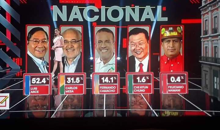 Realidades.- El candidato del Movimiento al Socialismo (MAS), Luis Arce, habría ganado las elecciones presidenciales de Bolivia en primera vuelta con el 52,4% de los votos, reveló una encuesta a boca de urna realizada por la empresa Ciesmori y que fue … Continúa leyendo Partido MAS triunfa en la elección presidencial de Bolivia con el 52.4% a pesar de la persecusión con Evo Morales desde el