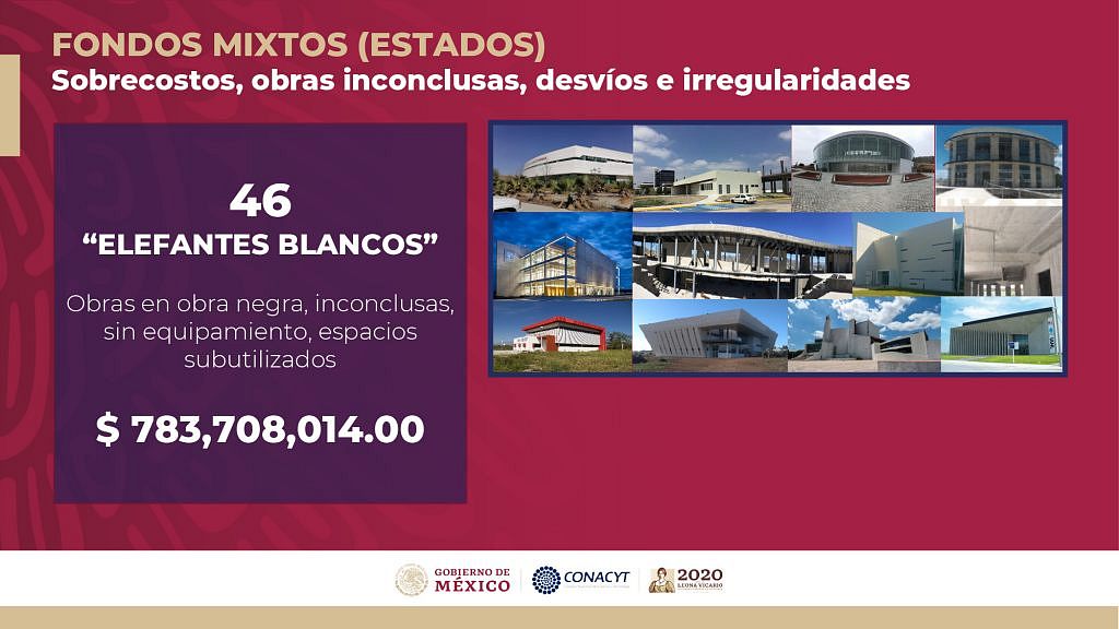 De éstos destacan “46 elefantes blancos: obras inconclusas, y edificios muy elegantes que implicaron cuantiosas cantidades de dinero, otros en obra negra, sin equipamiento o con espacios subutilizados, cuyo costo total fue de 783 millones de pesos 708 mil 14 pesos“, señaló Álvarez-Buylla, durante la conferencia presidencial.
