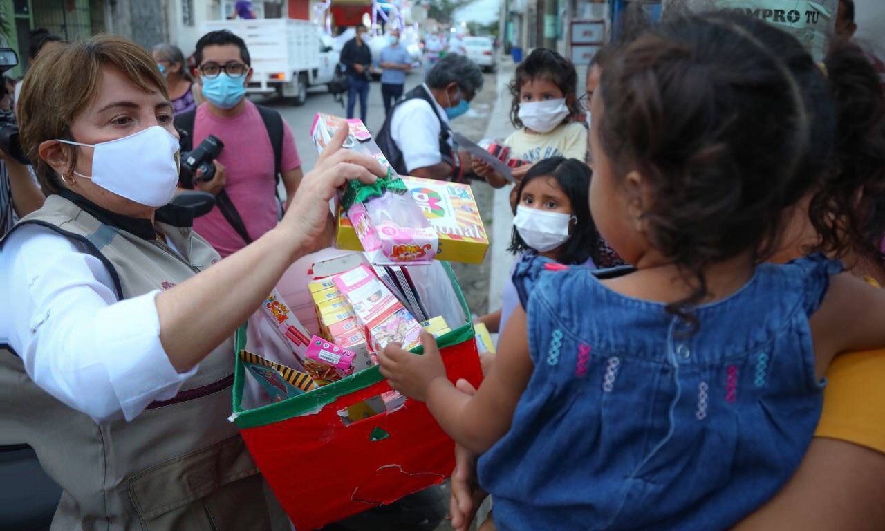 Realidades.- A fin de contribuir a difundir las tradiciones y fortalecer el tejido social, la presidenta Laura Beristain Navarrete llevó alegría a niñas y niños de la colonia Nicte-Ha a través del programa “Ya llegó la Navidad”, con el cual acerca a familias de escasos recursos juguetes y kits sanitizantes con motivo del Día de Reyes.