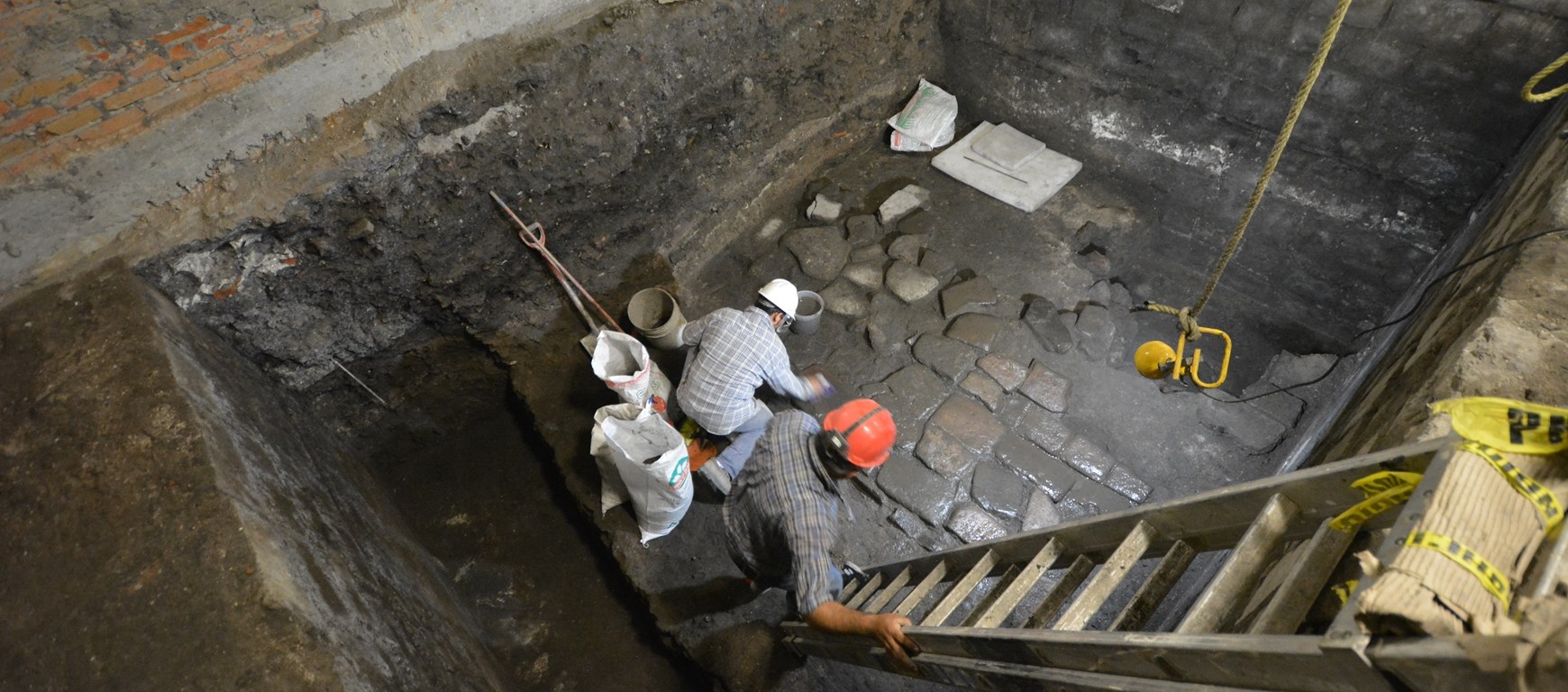 Raúl Barrera y José García explican que se hicieron doce pozos de sondeo en torno al patio con 1.5 metros de profundidad. Cabe señalar que también se realizaban trabajos de reforzamiento de las columnas que delimitan y sostienen el primer piso del inmueble. En los pozos de los lados norte, este y oeste se encontraron restos de un muro de piedra y argamasa; las medidas son 1.50 metros de alto por 1.25 de ancho y sirvió como cimiento del inmueble edificado en 1755.