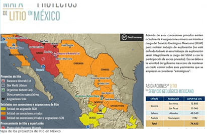 Según datos del Informe El litio: la nueva disputa comercial dinamizada por el falso mercado verde, efectuado por las organizaciones Mining Watch Canada, Red Mexicana de Afectados por la Minería (Rema) y Colectivo Geocomunes, el gobierno federal de Enrique Peña Nieto avaló un total de 36 proyectos de 10 compañías de capital extranjero para explotar el mineral en más de 527 mil hectáreas en el país.