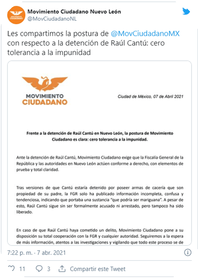 El partido aseguró que colaborará con la FGR en caso de que Raúl Cantú haya cometido un delito, pero vigilará que el proceso esté apegado a la ley.
