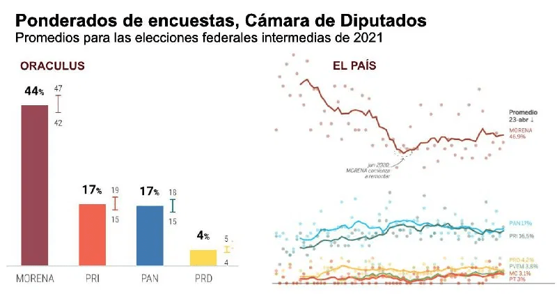 Realidades.- A mes y medio de las elecciones del 6 de junio, los ponderados de El País y Oraculus perfilan que el partido fundado por Andrés Manuel López Obrador se quedará con la mayoría de San Lázaro, con lo que el proyecto del Gobierno federal podría avanzar en la segunda mitad del sexenio.