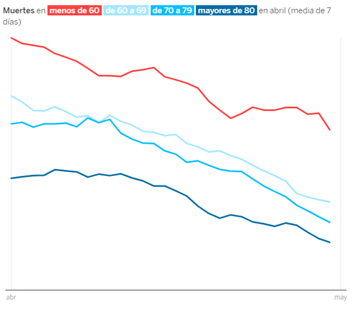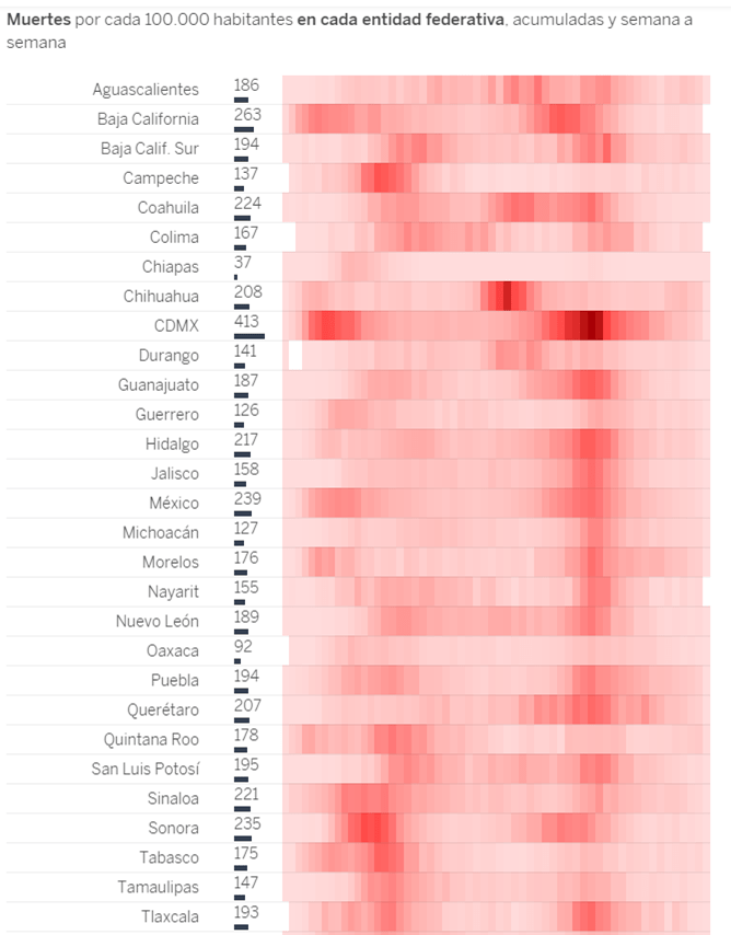 Desde finales de diciembre, México ha administrado alrededor de 15 dosis por cada 100 habitantes. Menos de la mitad (apenas un 6%) dispone de la pauta de vacunación completa, que para el caso de todas las vacunas empleadas en el país es de doble dosis. Resulta difícil que esta incidencia haya supuesto un freno significativo al contagio o a la enfermedad que de él se deriva. En los datos, apenas se adivina que los mayores de sesenta años sí tienen un descenso ligeramente mayor durante abril de las muertes, pero parece difícil sacar conclusiones fuertes.