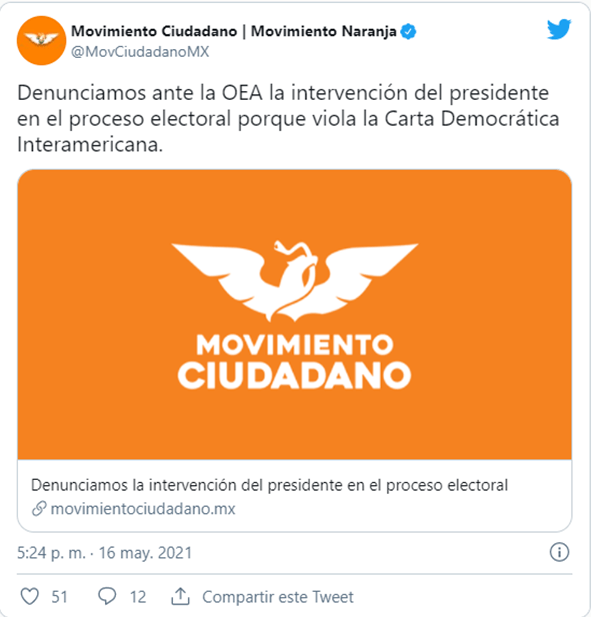 Movimiento Ciudadano también presentó ante la OEA una denuncia sobre hechos y violaciones constitucionales en las que ha incurrido el jefe del Ejecutivo durante el proceso electoral.