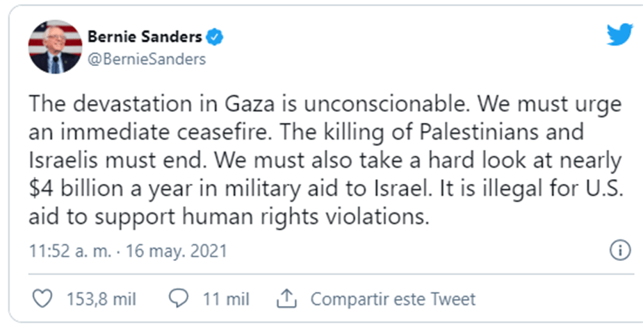 ‘es ilegal que la ayuda estadounidense apoye las violaciones de los derechos humanos’, aseveró. A través de Twitter, indicó que se debe instar a un alto al fuego inmediato y que la matanza de palestinos e israelíes debe terminar.