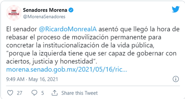 «Y se equivoca, no sólo porque usurpa funciones que no le corresponden, se equivoca porque deprecia la Ley y porque no sólo es una conducta antijurídica es delito grave», dijo. «Por eso, la mayoría legislativa, conformada con senadores y senadoras de Morena, hemos decidido, conscientemente, cerrar filas, respaldar y apoyar al Presidente México, Andrés Manuel López Obrador. No lo vamos a dejar solo».