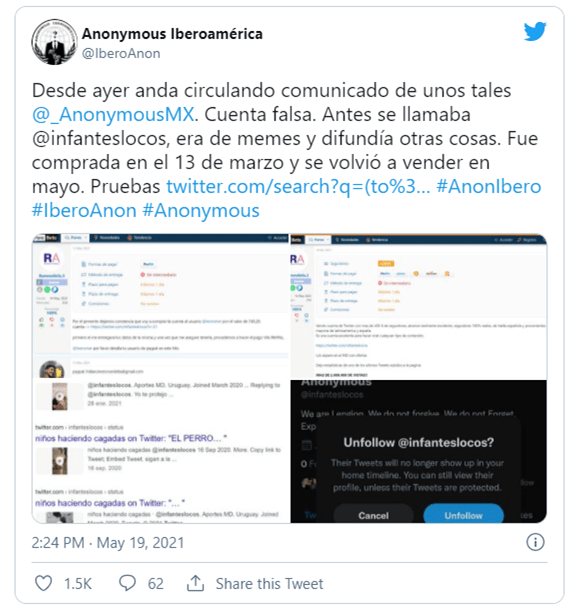 La cuenta real de Anonymos Iberoamérica también adjuntó pruebas de que se trata de una imitación, donde revela mensajes de la compraventa del perfil.