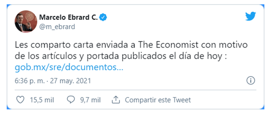 Asimismo, señaló que el medio ha criticado el manejo de México ante la pandemia de COVID-19, pero ignora la acelerada reconversión hospitalaria, la adquisición de vacunas y la recuperación económica que experimenta la nación este año.
