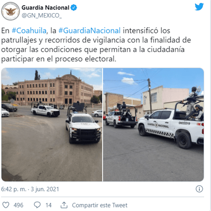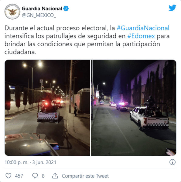 La Guardia Nacional (GN) anunció que con el fin de brindar condiciones de seguridad que permitan la participación ciudadana durante la jornada electoral del próximo domingo 6 de junio, intensificó sus patrullajes en todos los estados del país.