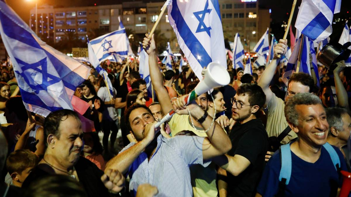 Manifestantes cantan y bailan frente al Palacio de Gobierno de Jerusalén