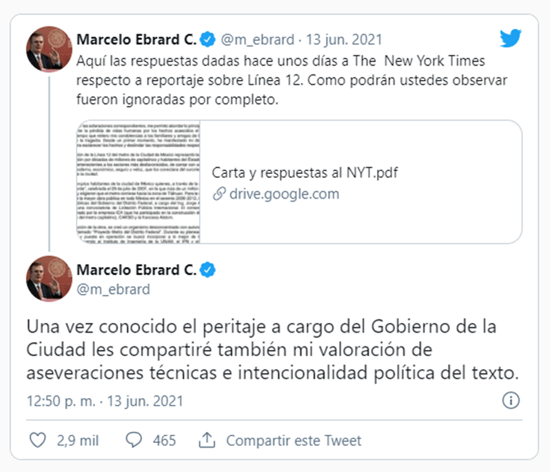 A través de una carta de 15 cuartillas, el canciller Marcelo Ebrard Casaubón le respondió este domingo al periódico estadounidense The New York Times, el cual publicó un texto sobre el colapso en la Línea 12 del Metro, ocurrido el pasado 3 de mayo.