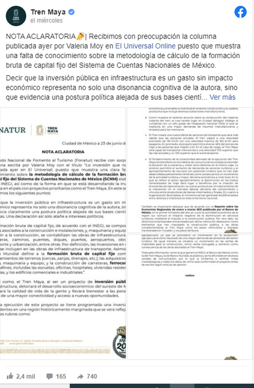 Al respecto, el Fonatur afirmó que recibió con preocupación la columna. Puesto que muestra una falta de conocimiento sobre la metodología de cálculo de la formación bruta de capital fijo. Del Sistema de Cuentas Nacionales de México.