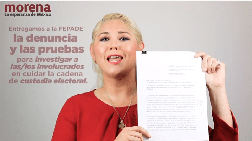 REALIDADES, MÉRIDA.- Verónica Camino Farjat, excandidata a la alcaldía de Mérida por Morena, informó esta tarde de la denuncia penal interpuesta ante la Fiscalía Especializada en Delitos Electorales (Fepade) por presuntas irregularidades en el traslado de los paquetes electorales.