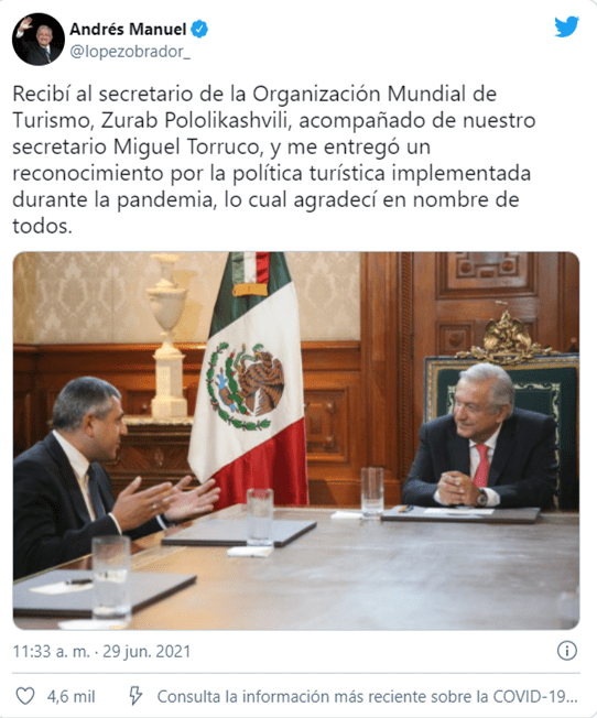 “Recibí al secretario de la Organización Mundial de Turismo, Zurab Pololikashvili, acompañado de nuestro secretario Miguel Torruco, y me entregó un reconocimiento por la política turística implementada durante la pandemia, lo cual agradecí en nombre de todos”.