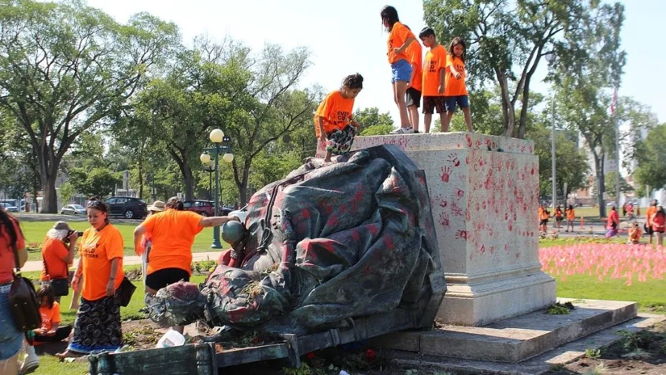 Realidades.- Winnipeg. Manifestantes derribaron estatuas de las reinas Victoria e Isabel II en esta ciudad, a medida que aumenta la ira por el descubrimiento de los restos de cientos de niños en fosas sin identificar en antiguas escuelas “de integración”, internados adonde menores indígenas arrebatados de sus familias eran obligados a asistir para separarlos de sus culturas originales.