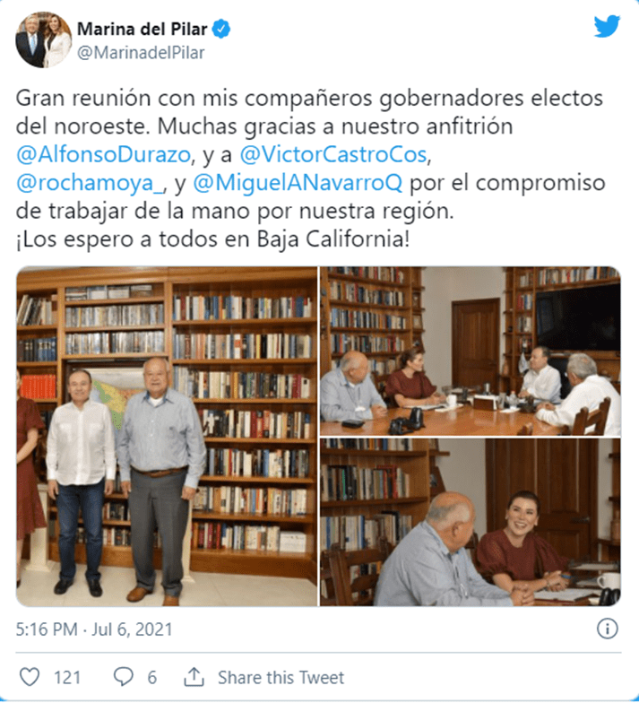 «Celebro la reunión con mis colegas gobernadora y gobernadores electos. El objetivo común es regionalizar temas que nos interesan en igual medida. El turismo, la seguridad, la investigación, apoyo a la industria agropecuaria y coordinar el desarrollo competitivo del noroeste de México», escribió Rocha Moya.