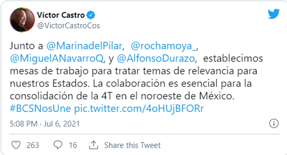 «Establecimos mesas de trabajo para tratar temas de relevancia para nuestros Estados. La colaboración es esencial para la consolidación de la 4T en el noroeste de México», añadió Castro Cosío en Facebook. Mientras que el doctor Navarro escribió en Twitter que con esta unión «vamos hacia un nuevo federalismo regional». «¡Nayarit estará presente en el mundo!», sentenció el gobernador electo.