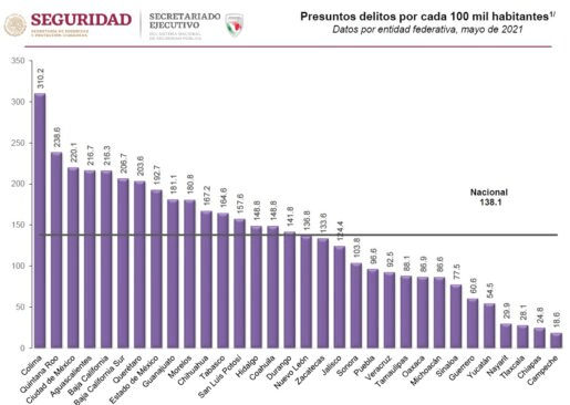 En su más reciente reporte del SESNSP se establece que en mayo Quintana Roo registró una tasa de incidencia de 238.6 presuntos delitos por cada 100 mil habitantes. Por ciento la media nacional es de 138.1 por ciento.