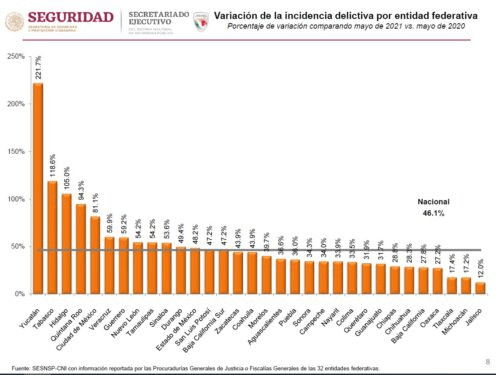 Aunque en el porcentaje de variación comparado de mayo 2021, contra abril de 2021 la entidad se ubicó en el lugar 13 nacional, también registró un crecimiento del 4.3 por ciento en los presuntos delitos.