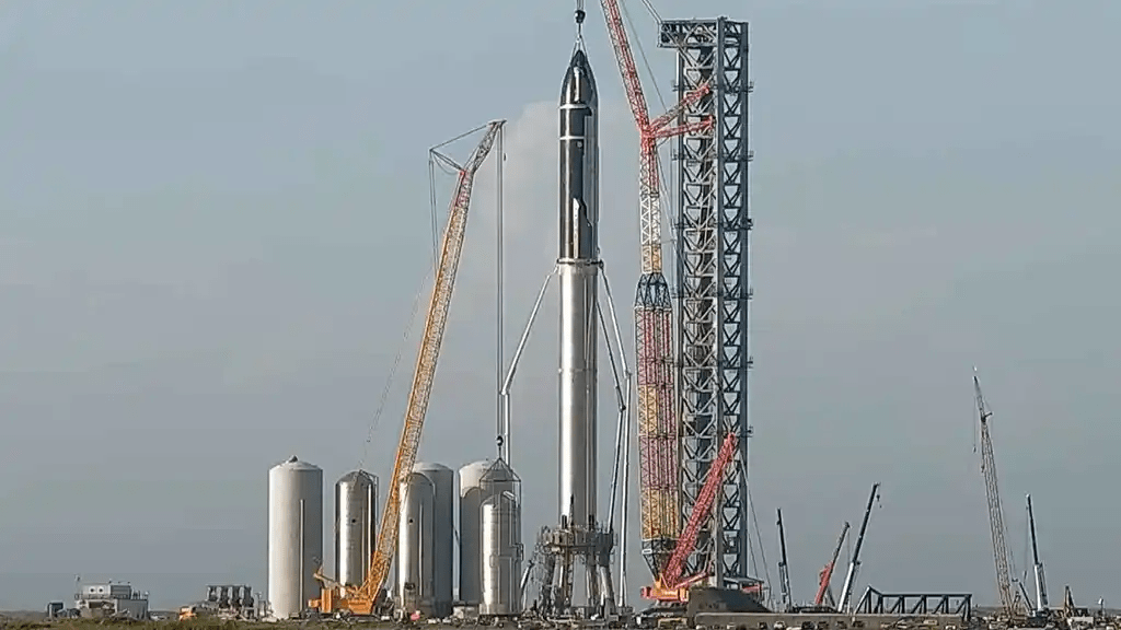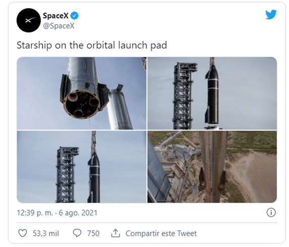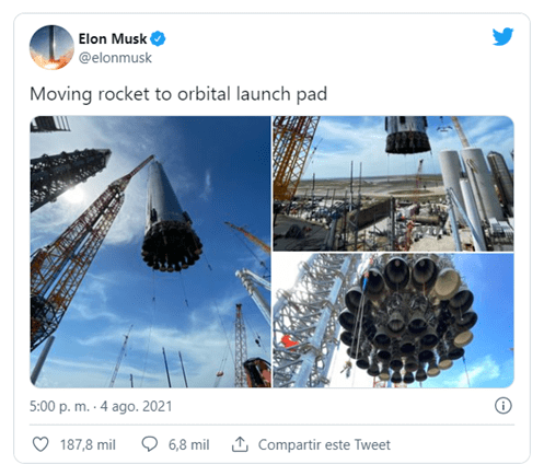 «Nave espacial en la plataforma de lanzamiento orbital», escribió la compañía este viernes en una publicación de Twitter junto a varias fotografías que muestran como una grúa gigante completa el montaje del enorme cohete en Boca Chica, en Texas (EE.UU.).