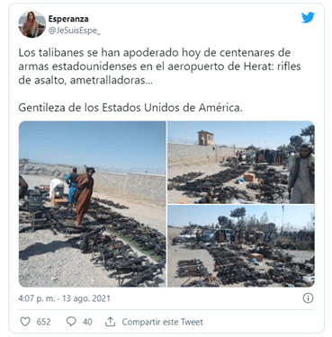 Y lo han hecho 15 días antes de la fecha anunciada por Biden de retirada de todas sus tropas del país, una retirada que comenzó a principios de mayo y que involucra a 9.600 soldados, 2.500 de ellos estadounidenses, aunque los medios estadounidenses aseguran que la cifra real es de unos 1.000 efectivos más, y alrededor de 7.000 miembros de las fuerzas internacionales de la coalición, la mayoría de ellos, de la OTAN.En realidad, el avance de las tropas talibanes hasta controlar todo el país no ha sido una guerra, ha durado menos de diez días, y ha sido un mero trasvase del poder de los ocupantes estadounidenses a los talibanes.Si se repasa la cronología se comprueba que cada provincia, cada capital, cada base militar que han ido abandonando los estadounidenses era tomada por los talibanes quedándose con las correspondientes armas, municiones, víveres y vehículos militares dejados por los estadounidenses.