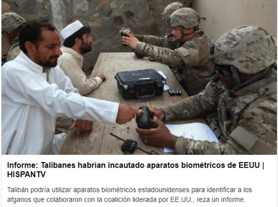 “Es inconcebible que el equipo militar de alta tecnología pagado por los contribuyentes estadounidenses haya caído en manos de los talibanes […] Asegurar los activos estadounidenses debería haber estado entre las principales prioridades del Departamento de Defensa de Estados Unidos antes de anunciar la retirada de Afganistán”, acotan los senadores.Informe: Talibanes habrían incautado aparatos biométricos de EEUU | HISPANTVTalibán podría utilizar aparatos biométricos estadounidenses para identificar a los afganos que colaboraron con la coalición liderada por EE.UU., reza un informe.