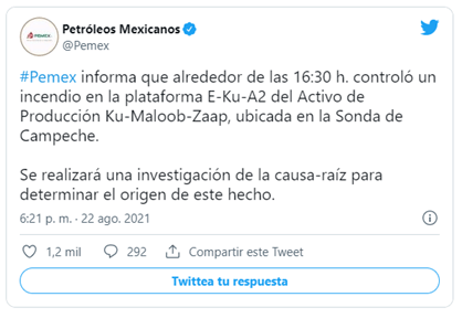 “Se realizará una investigación de la causa-raíz para determinar el origen de este hecho” dijo Pemex en su cuenta de Twitter.