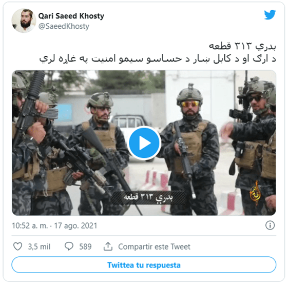 «(…) se está desplegando no solo en Kabul sino también en otros lugares que ha proporcionado una imagen completamente diferente. No son más los hijos de agricultores y pastores, es un grupo heterogéneo de terroristas religiosos, pero un grupo de operaciones especiales comparable, quizás, con el mejor del mundo. Con los talibanes ahora en el poder, hay muchas razones para creer que la milicia podría fortalecerse en las próximas semanas y meses», dijo el editor senior y presentador de televisión de India Today, Shiv Aroor.