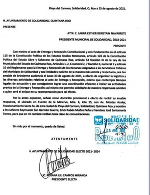REALIDADES, PLAYA DEL CARMEN, Quintana Roo. – La presidente municipal electa, Lili Campos solicitó formalmente en un oficio dirigido al Ayuntamiento de Solidaridad con copia a Laura Beristain, el inicio del proceso de entrega recepción.