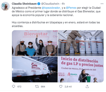 Al respecto, Sheinbaum adelantó que las siguientes alcaldías a donde llegará Gas Bienestar serán Azcapotzalco, Xochimilco Gustavo A. Madero, Milpa Alta y Tláhuac, de forma que para enero del 2022 el servicio de Gas Bienestar llegue a toda la Ciudad de México.