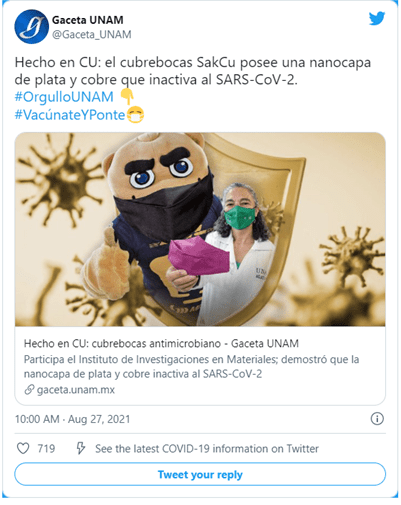 De hecho, para descartar cualquier riesgo tóxico en contacto con la piel, la UNAM contó con la colaboración del Instituto Nacional de Rehabilitación a fin de someter a pruebas de cicotoxicidad a la superficie de plata-cobre que integra la mascarilla. Luego de medir el efecto de la nanocapa en contacto con la piel, el resultado no entregó efectos tóxicos, es decir, la respuesta fue la misma que en los cubrebocas comerciales.
