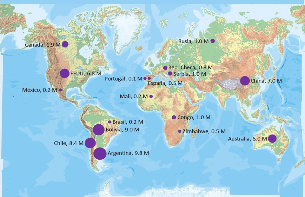 Actualmente, el principal consumidor de litio es China, con 35% de la demanda total mundial, seguido de Europa, Japón, Corea y América del Norte, con 24%, 12%, 10% y 9% del consumo mundial, en ese orden.